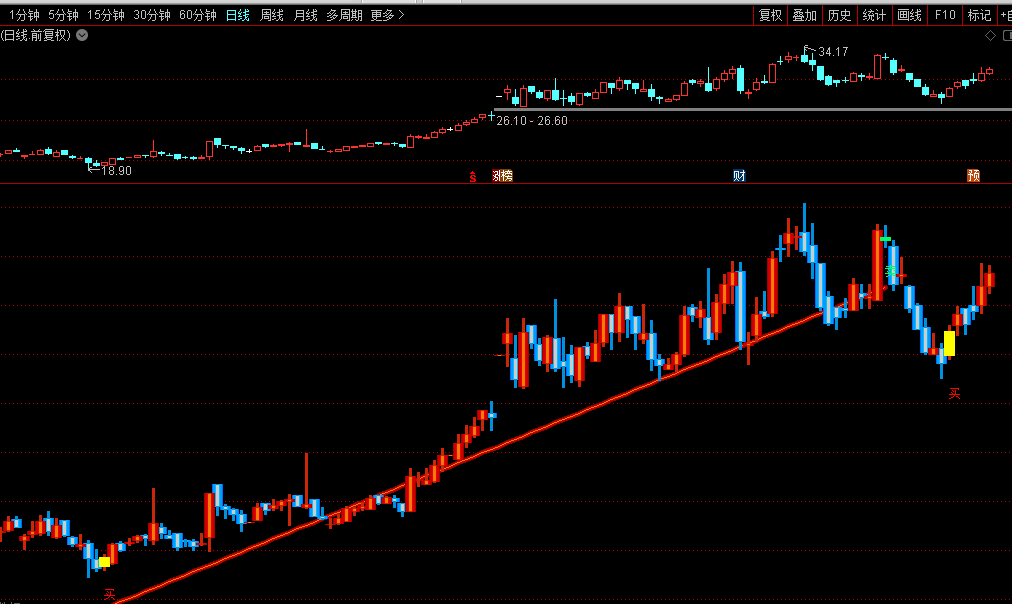 买:DRAWTEXT((REF(VAR14,2) > REF(VAR14,1)) AND (VAR14 > REF(VAR14,1)),LOW - (LOW)*(0.05),'买'),COLORRED;