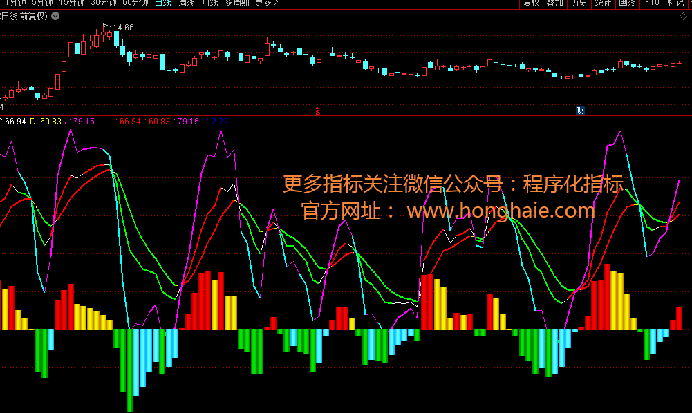 STICKLINE((K-D)*2>=0 AND (K-D)*2<REF((K-D)*2,1),(K-D)*2,0,3,0 ),COLORFF66FF;