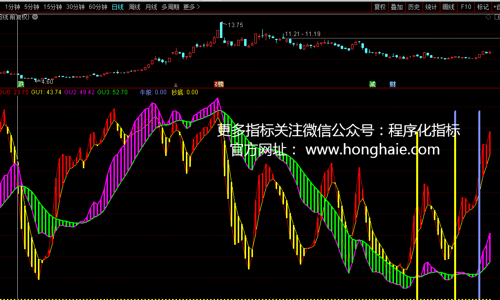 抄底:IF(BARSLAST(CROSS(GU2,GU3))<12 AND CROSS(GU2,GU3) AND GU3<12,78,0),STICK,COLORYELLOW;
