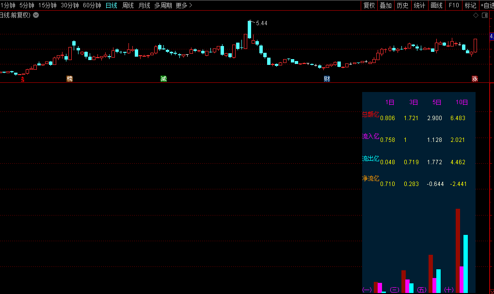 DRAWTEXT(CURRBARSCOUNT=30,画*0.67,'流出亿'),COLORCYAN;