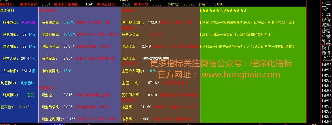 DRAWTEXT_FIX(1,0.40,0.35,0,'流动比率:'),COLOR00CCCC;{流动比率值>1.5<2.5较为合理,低于1说明偿债能力欠佳。}