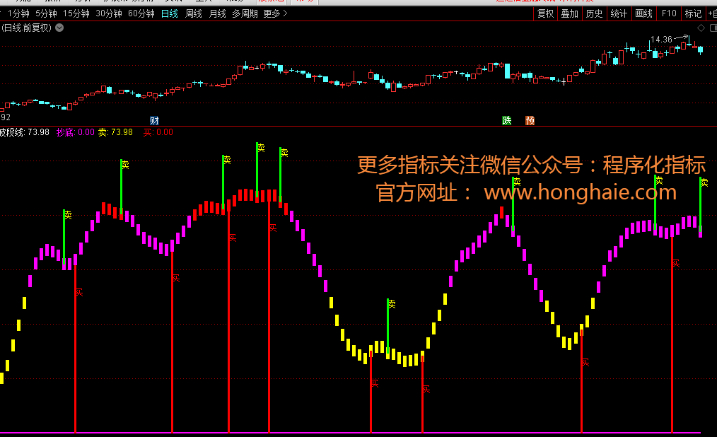 抄底:IF(CROSS(波段线,8) OR CROSS(波段线,15),波段线*3.0,0),COLORMAGENTA,LINETHICK2;