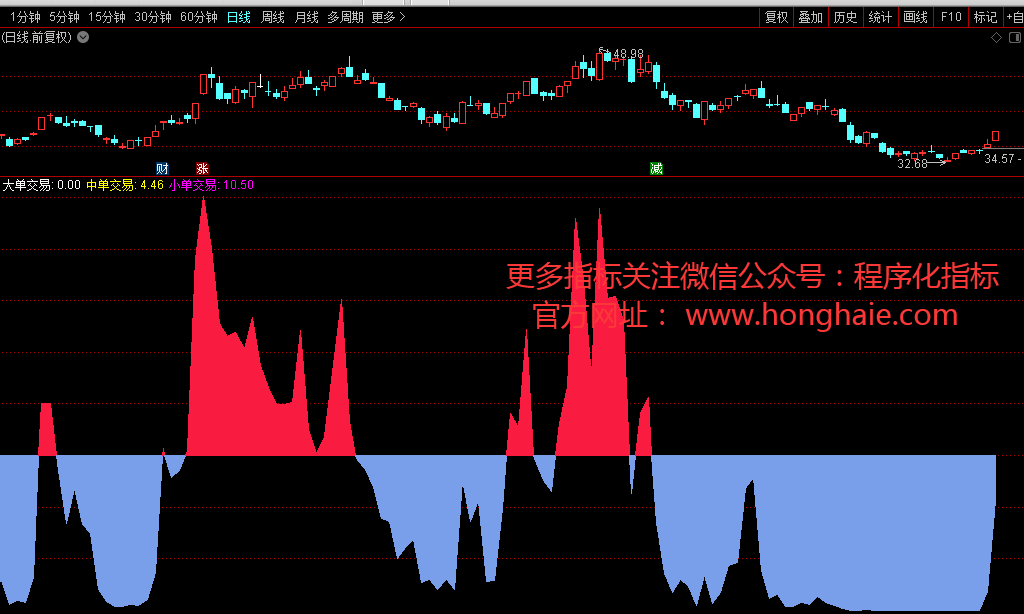 小单交易:(IF(HIGH=LOW,1,MAX(CLOSE,OPEN)-((HIGH+LOW+CLOSE)/3)))*((VOL/(IF(HIGH=LOW,4,HIGH-LOW)))/10000),NODRAW;