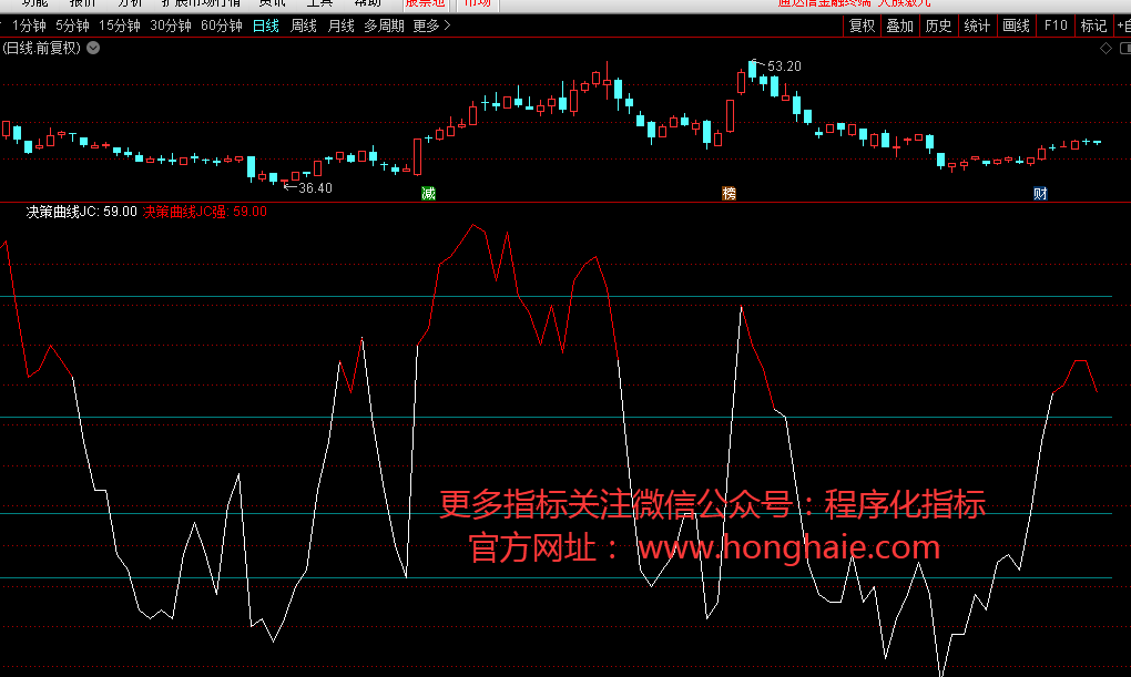 决策曲线JC强:IF(决策曲线>56,决策曲线,DRAWNULL),COLORRED;