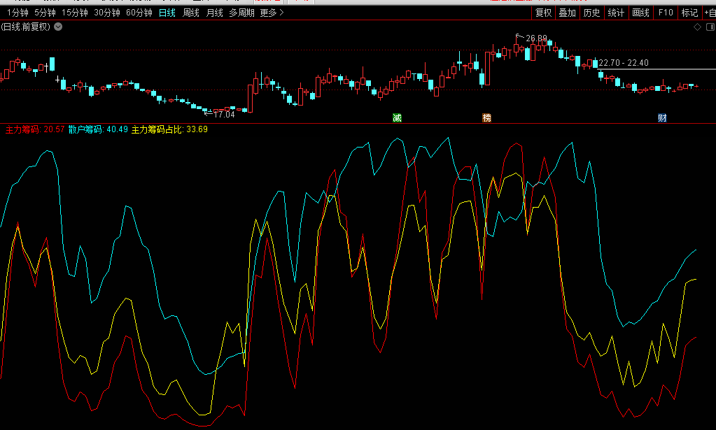 主力筹码占比:主力筹码/(主力筹码+散户筹码)*100,COLORYELLOW;