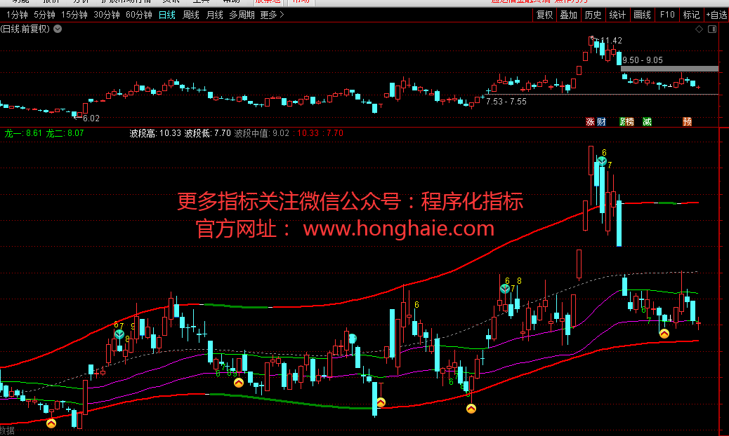 IF(波段高<=REF(波段高,1),波段高,DRAWNULL),COLOR008800,LINETHICK3;