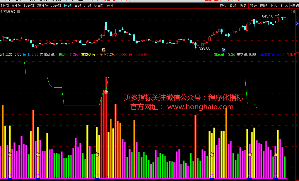 预测量:=IF(CURRBARSCOUNT=1 AND PERIOD=5,VOL*240/FROMOPEN,VOL),VOLSTICK;