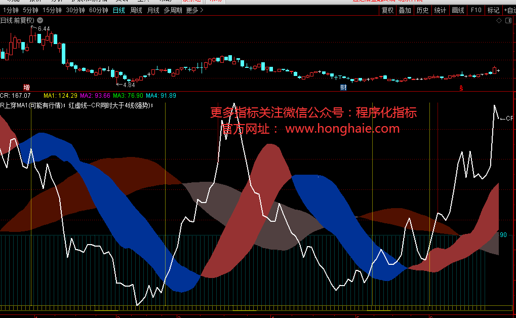 DRAWTEXT_FIX(1,0,0.00,0,'黄虚线--CR上穿MA1(可能有行情);红虚线--CR同时大于4线(强势);'),COLORWHITE;