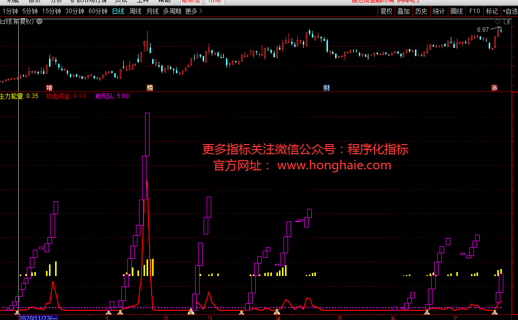 操盘:STICKLINE(主力能量>=0 AND 主力能量>=REF(主力能量,1),14.4,14.4+主力能量,1.5,0),{COLORRED}COLORYELLOW;