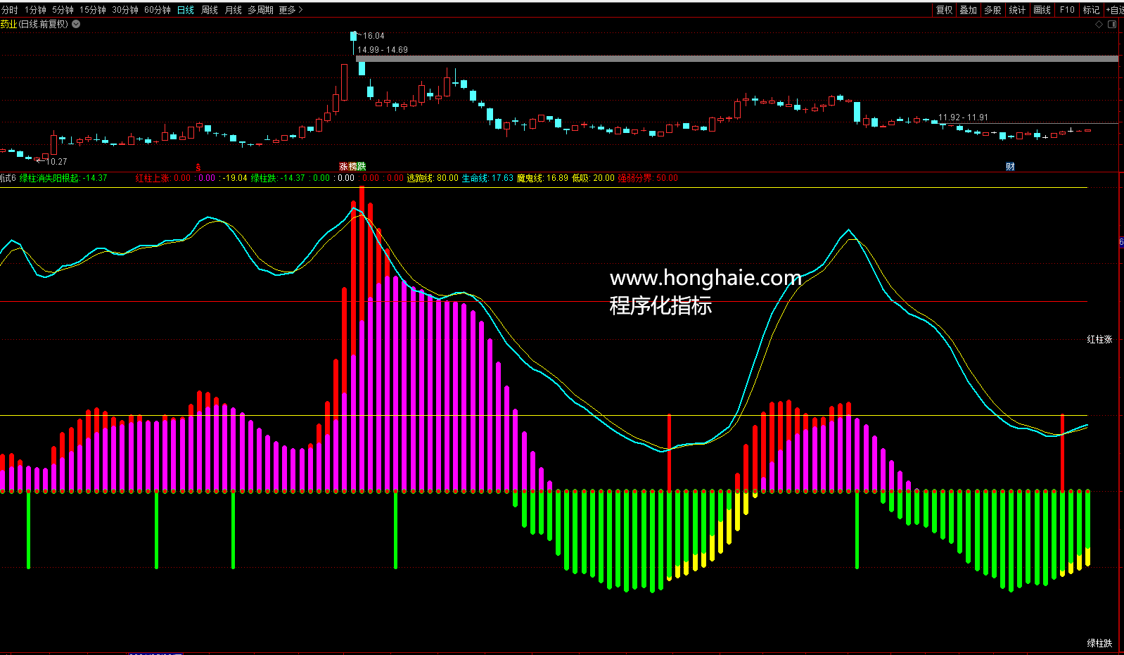 DRAWTEXT(ISLASTBAR,-40,'绿柱跌'),COLORWHITE;