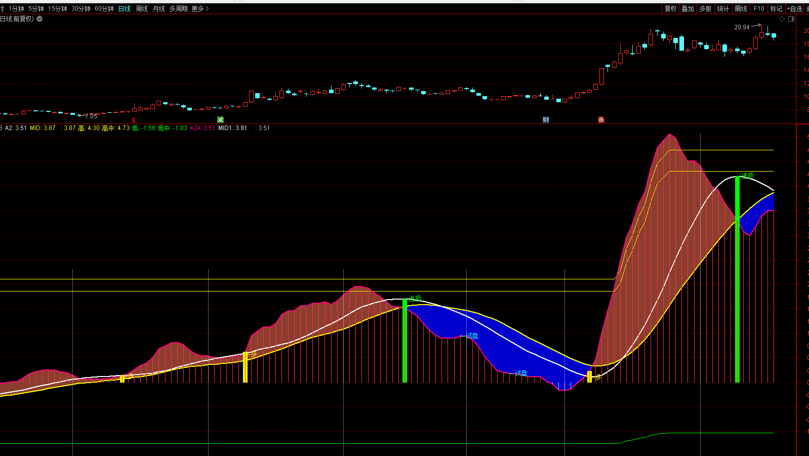 LR:= MID - 1.8*STD(A2,26)COLORGREEN; 高位:=HHV(A2,450),COLORGREEN,