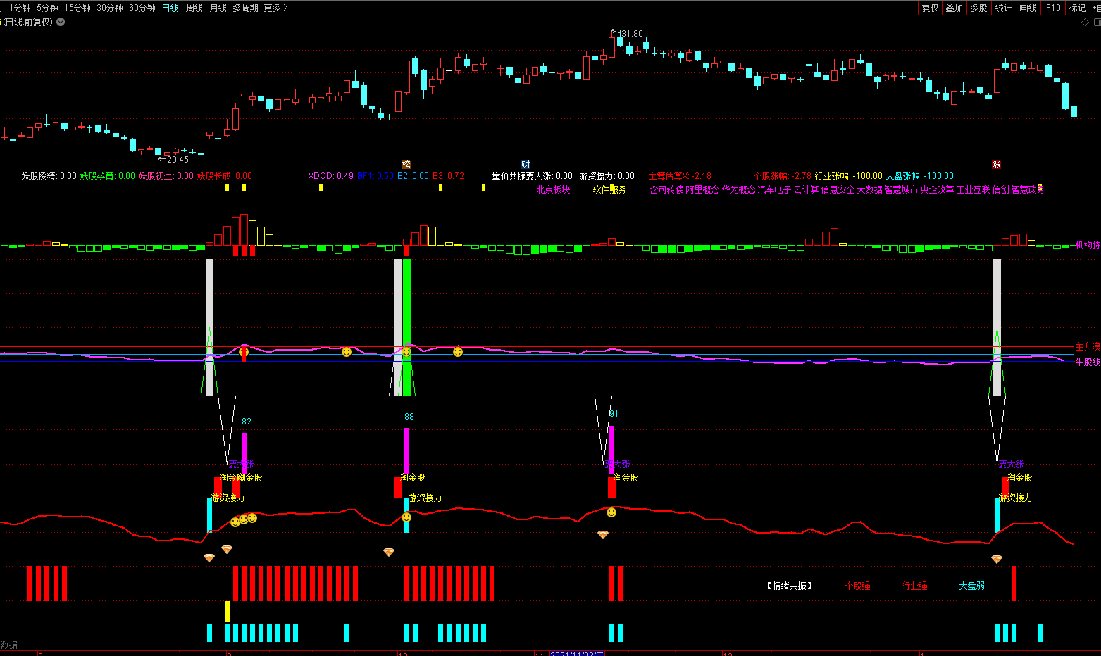 DRAWTEXT(ISLASTBAR, XDQD,' 牛股线'),COLORFF33FF;