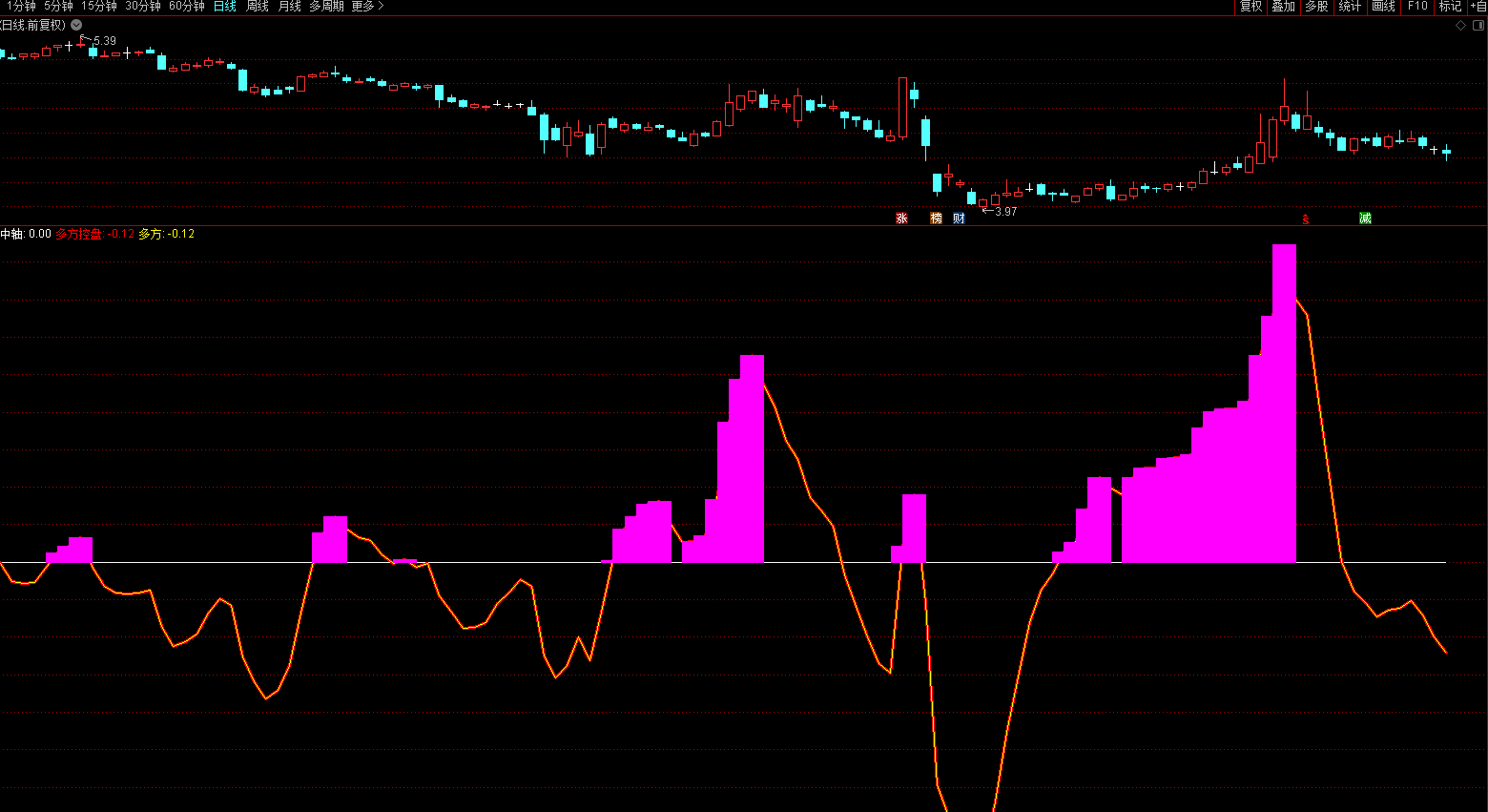 STICKLINE(多方控盘>=REF(多方控盘,1)AND 多方控盘>0,0,多方控盘,8,0),COLORMAGENTA;