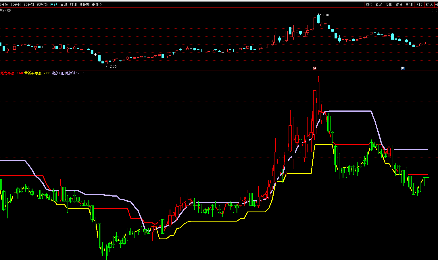 黄线买要涨:IF(C<B,C,B),COLORYELLOW,LINETHICK3;
