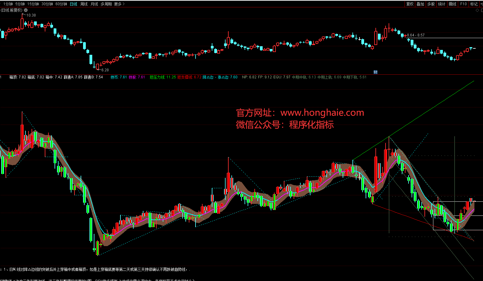 中期下轨:IF(NP>FP,IF(UTL<=RH,UTL,DRAWNULL),IF(UTL>=RL,UTL,DRAWNULL)),COLOR628962;