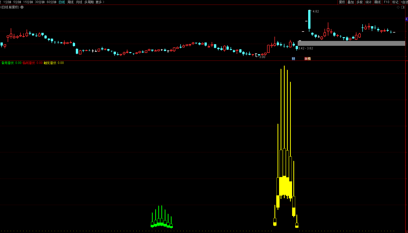 触发潜伏:IF(X_43>=0,X_43,DRAWNULL),POINTDOT,COLORYELLOW,LINETHICK2;