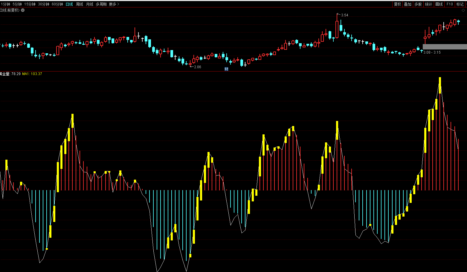 MA1:EMA(黄金量,Q2),COLORSTICK;