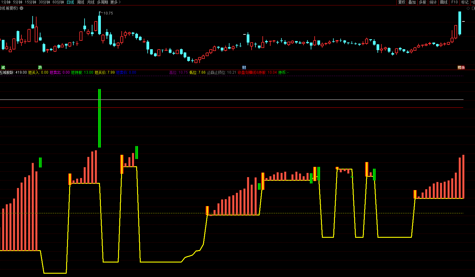 收盘划横线&持股:IF(CONST(α>β) AND DYNAINFO(7)>0,DYNAINFO(7),DRAWNULL),COLORRED,LINETHICK1;