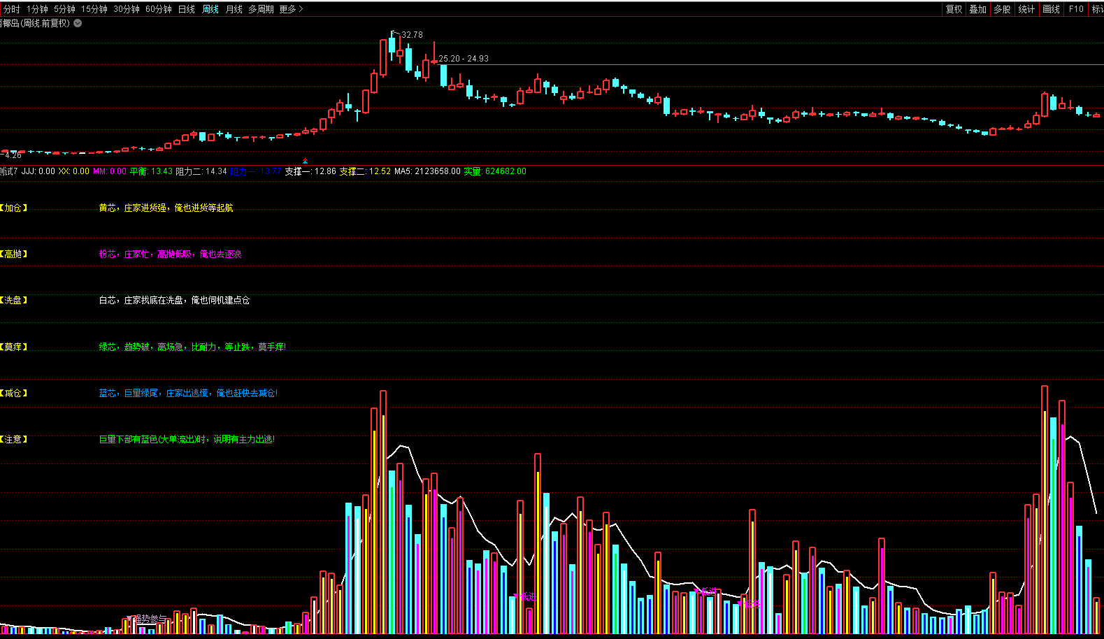 DRAWTEXT_FIX(1,0.1,0.55,0,'巨量下部有蓝色(大单流出)时,说明有主力出逃!'),COLOR00FF00,LINETHICK2;