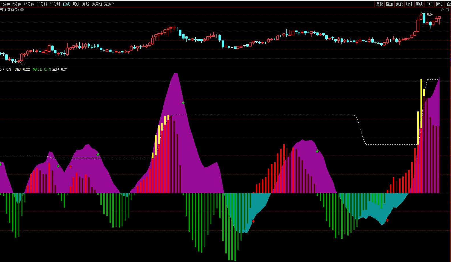 高线:MA(REF(HHV(MACD,周期),1),2),COLORWHITE,DOTLINE;