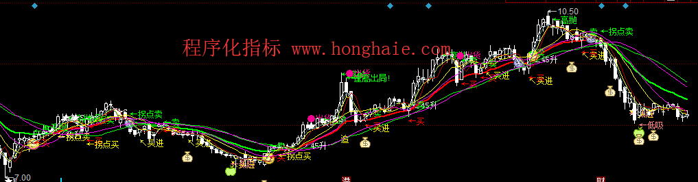 DRAWTEXT(FILTER(买=1,5),LOW-0.05,'↖买进'),coloryellow;