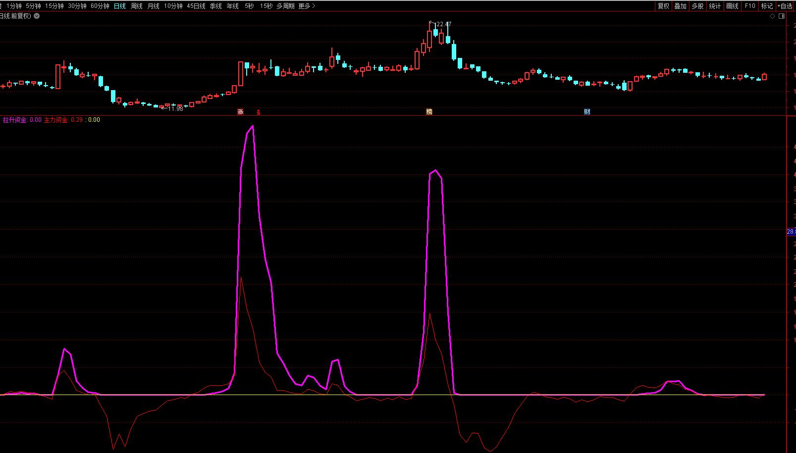 拉升资金:IF(VAR1D>0.015,VAR1F,0)/45,COLORMAGENTA,LINETHICK3;