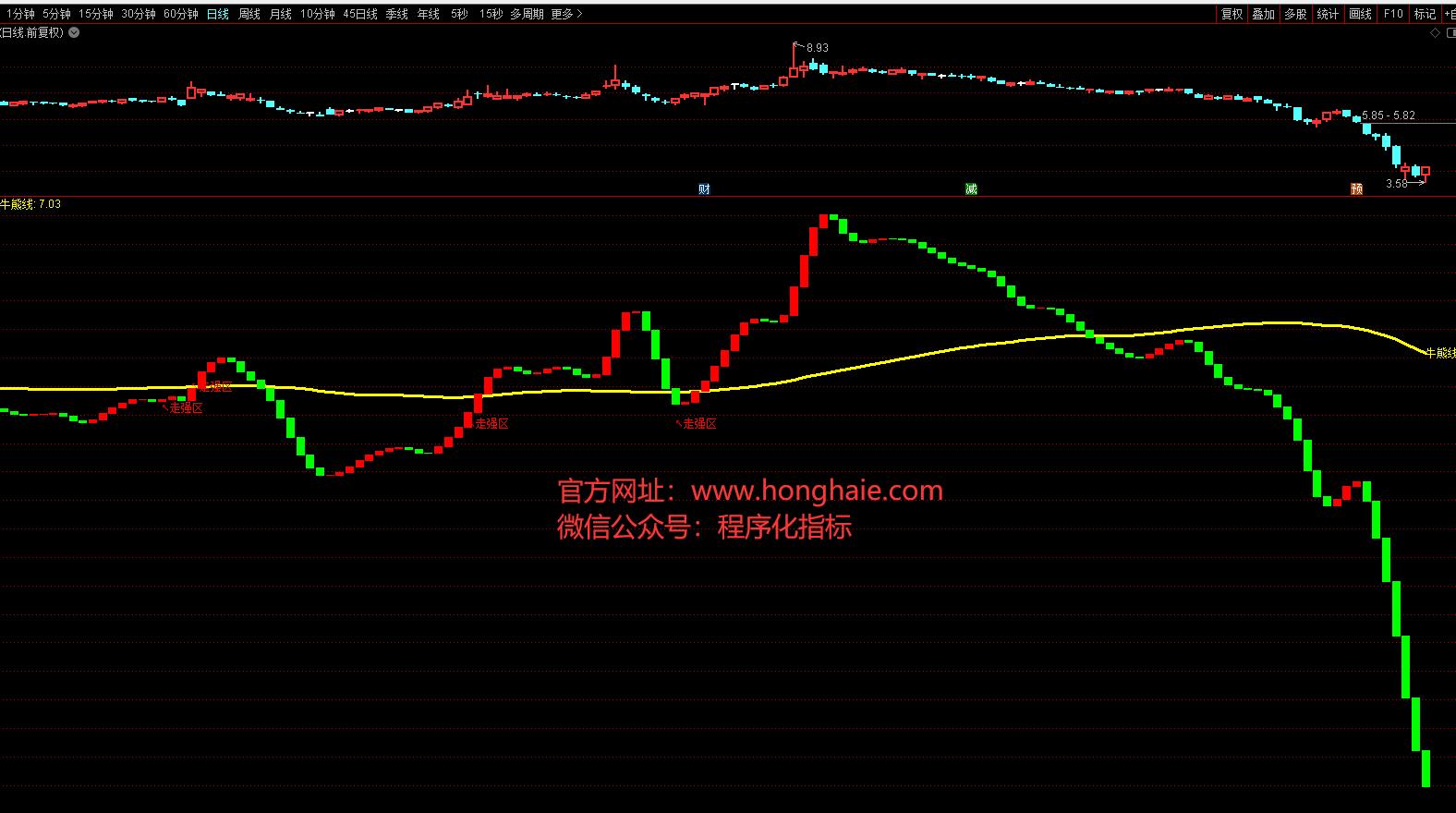 牛熊线:DMA(MA(CLOSE+REF(CLOSE,5)*XA1/CLOSE*0.098,90),VOL),LINETHICK3,COLORYELLOW;