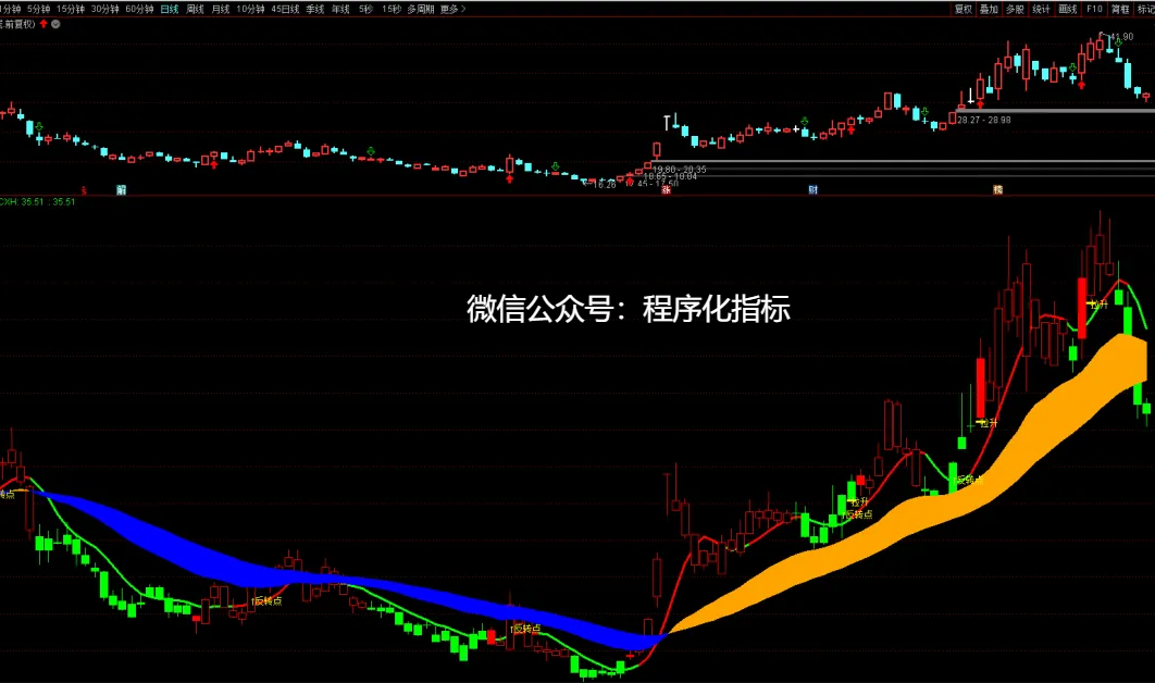 DRAWBAND(关注 ,RGB(0,0,255),程序化指标 ,RGB(255,165,0));