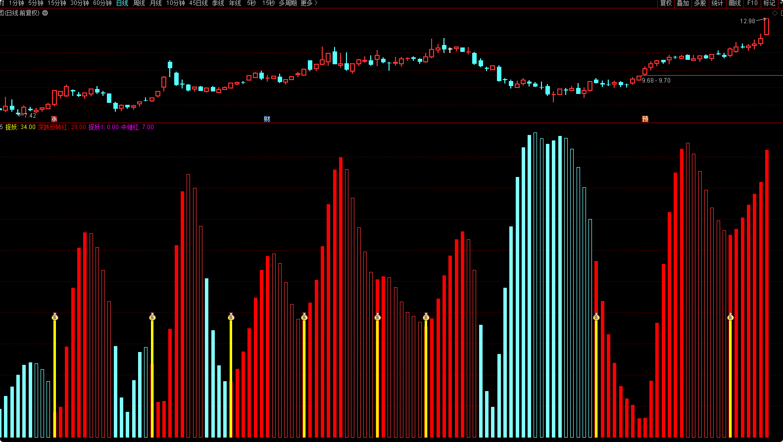 红实芯:STICKLINE(游资筹码7>=REF(游资筹码7,1) AND 游资筹码10>=REF(游资筹码10,1),0,游资筹码8,2,0),COLORRED;