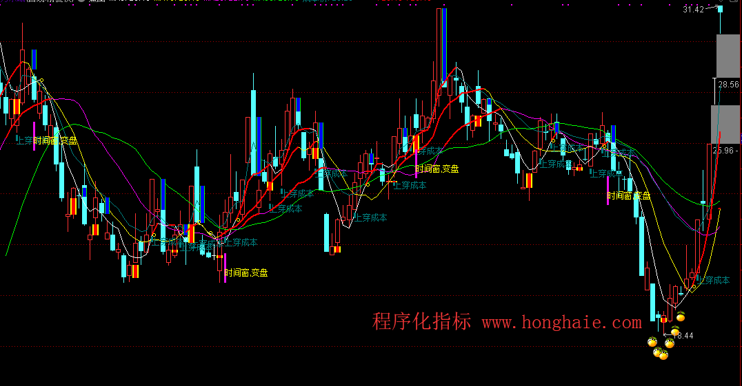 DRAWTEXT(CROSS(C,MCST),L-0.3,'上穿成本'),COLORLICYAN;