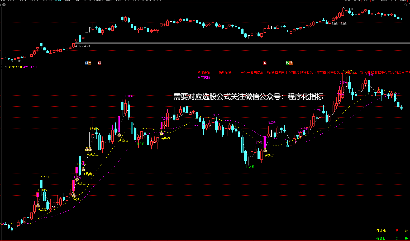 DRAWTEXT(最后1天=1 AND 连涨>=3 AND 求和<=10,H*1.01,VARCAT(VAR2STR(求和,1),'%')),COLORMAGENTA;