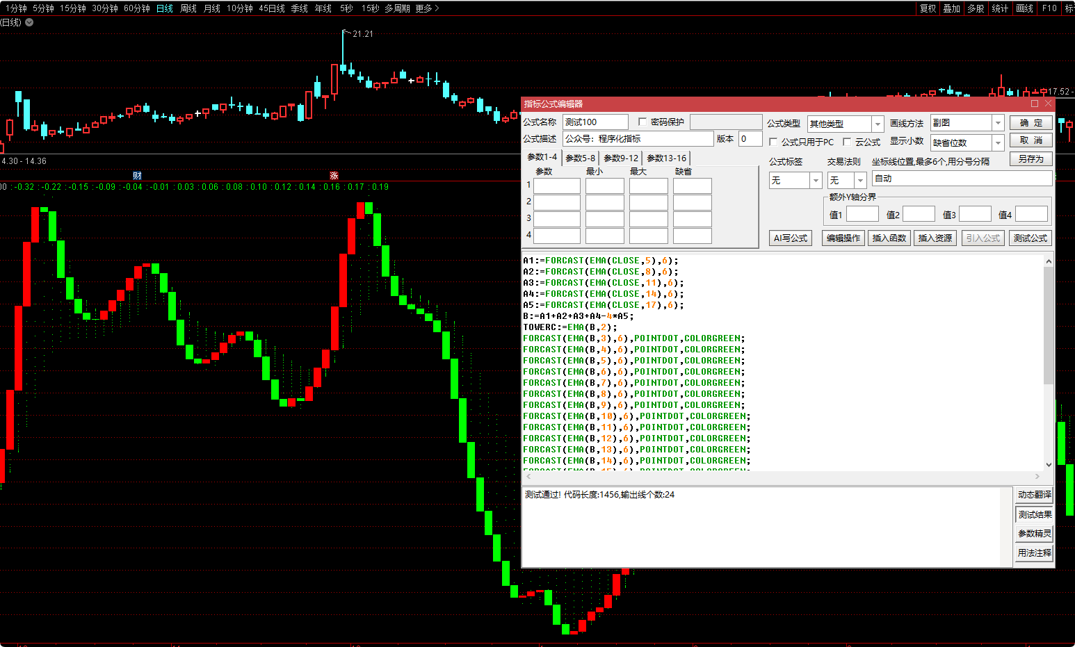FORCAST(EMA(B,17),6),POINTDOT,COLORGREEN;