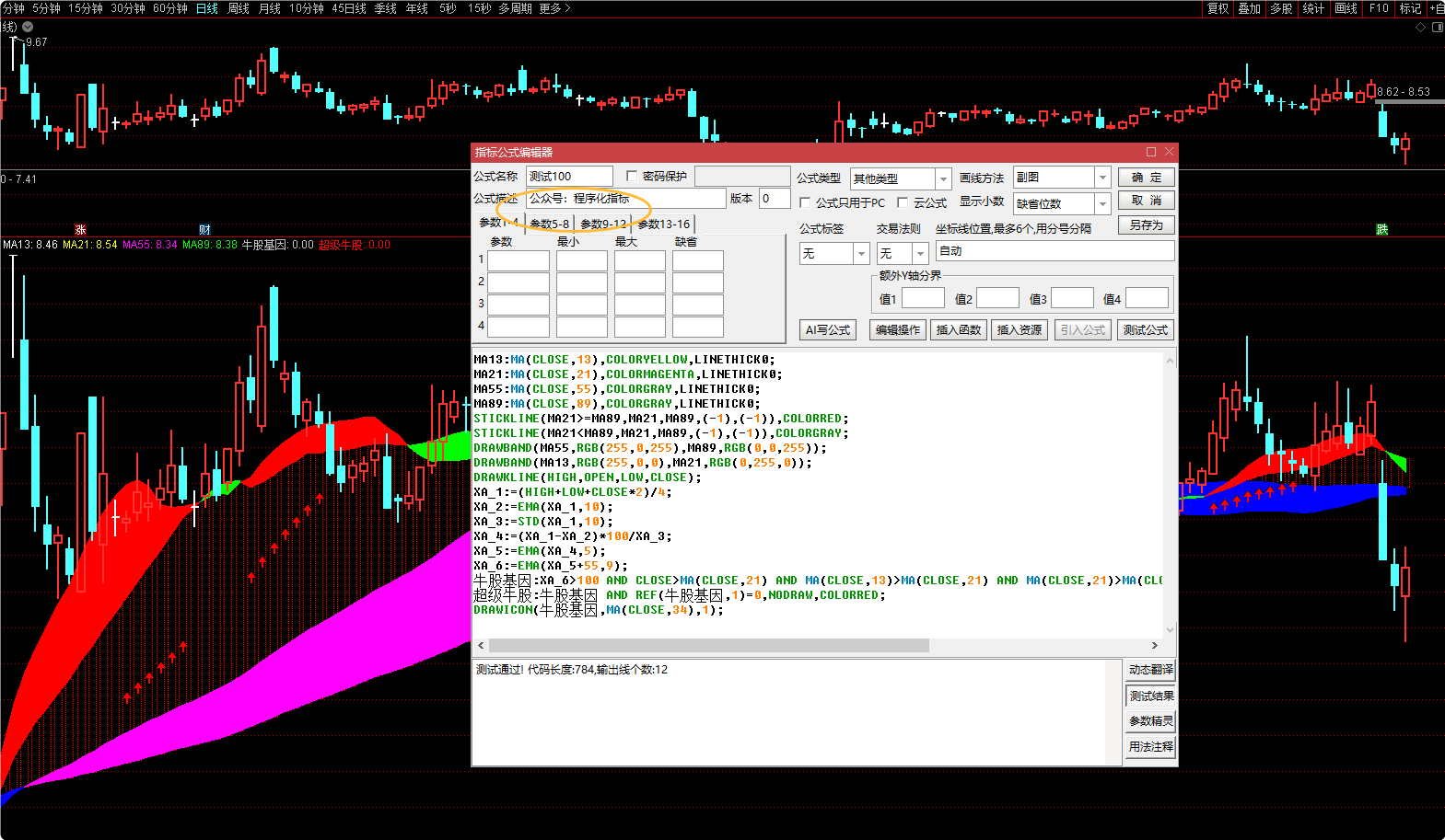 牛股基因:XA_6>100 AND CLOSE>MA(CLOSE,21) AND MA(CLOSE,13)>MA(CLOSE,21) AND MA(CLOSE,21)>MA(CLOSE,55) AND MA(CLOSE,55)>MA(CLOSE,144),NODRAW;