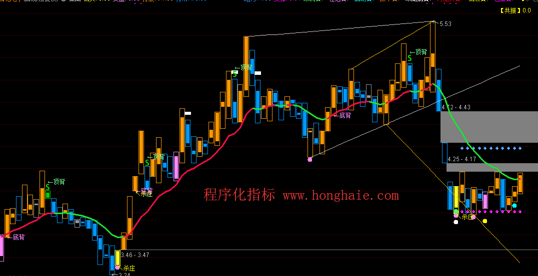 深坑1:=IF(BETWEEN(A4,0,5) AND L<=REF(C,A4)AND ZZF<=-5 ,20,0),COLORFF0000,LINETHICK2;
