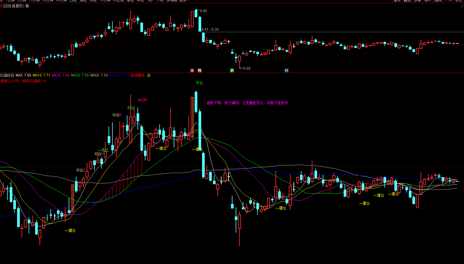 ( L<=MA20 AND C>MA20 OR (CROSS(MA5,MA20)) ),5);DRAWTEXT_FIX(1,0.02,0,0,'☆微信公众号:(程序化指标) ☆'),COLORRED;