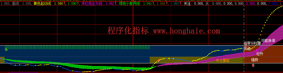 黄色起动线:EMA((CLOSE/VBNH),20)*1.01,COLORYELLOW,POINTDOT,linethick3;