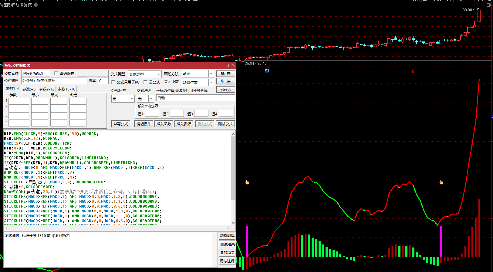 STICKLINE(MACD<=REF(MACD,1) AND MACD>0,0,MACD,0.6,0),COLOR40FF00;