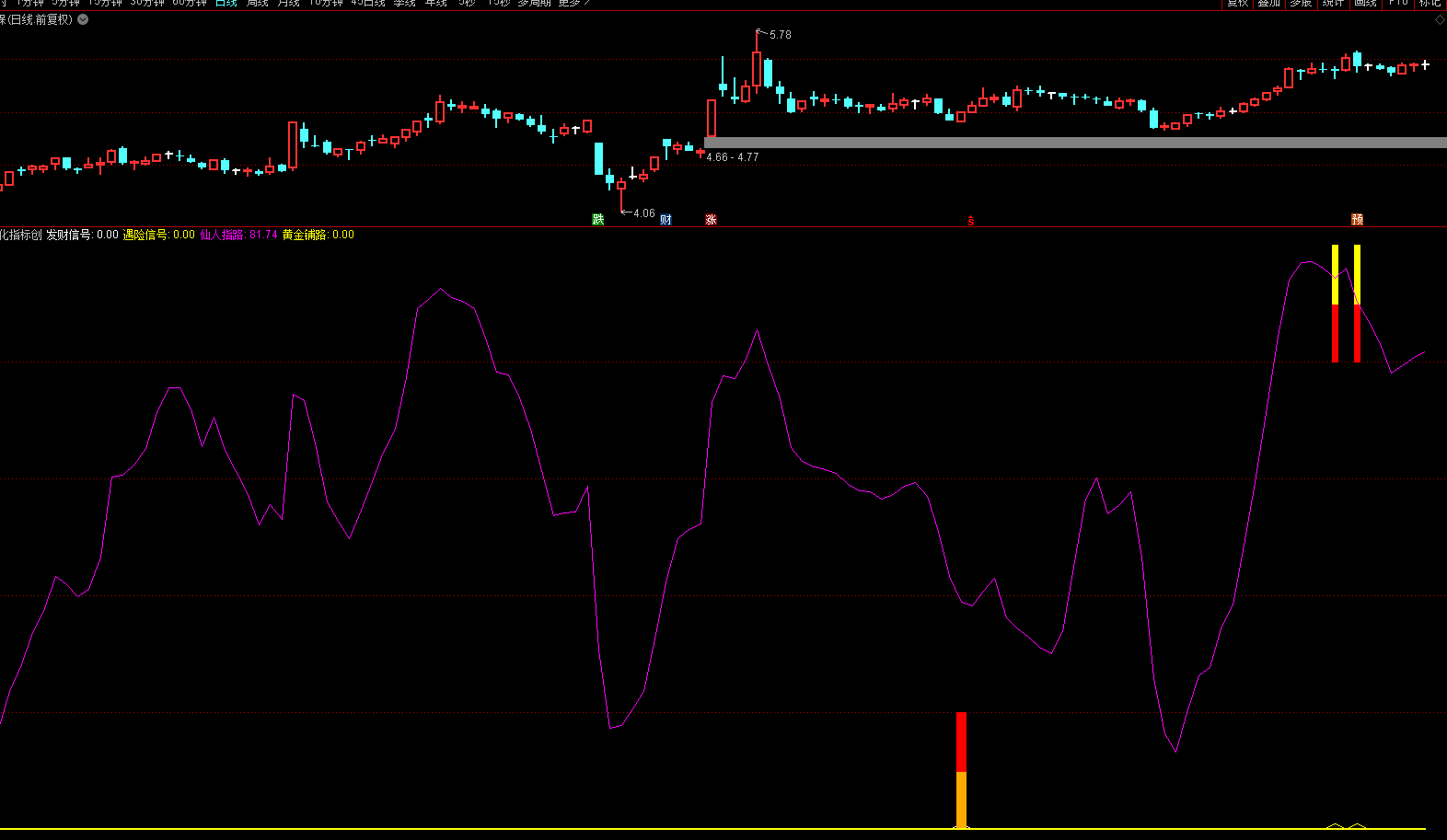 黄金铺路:仙人指路≤10的超卖信号(黄线)
