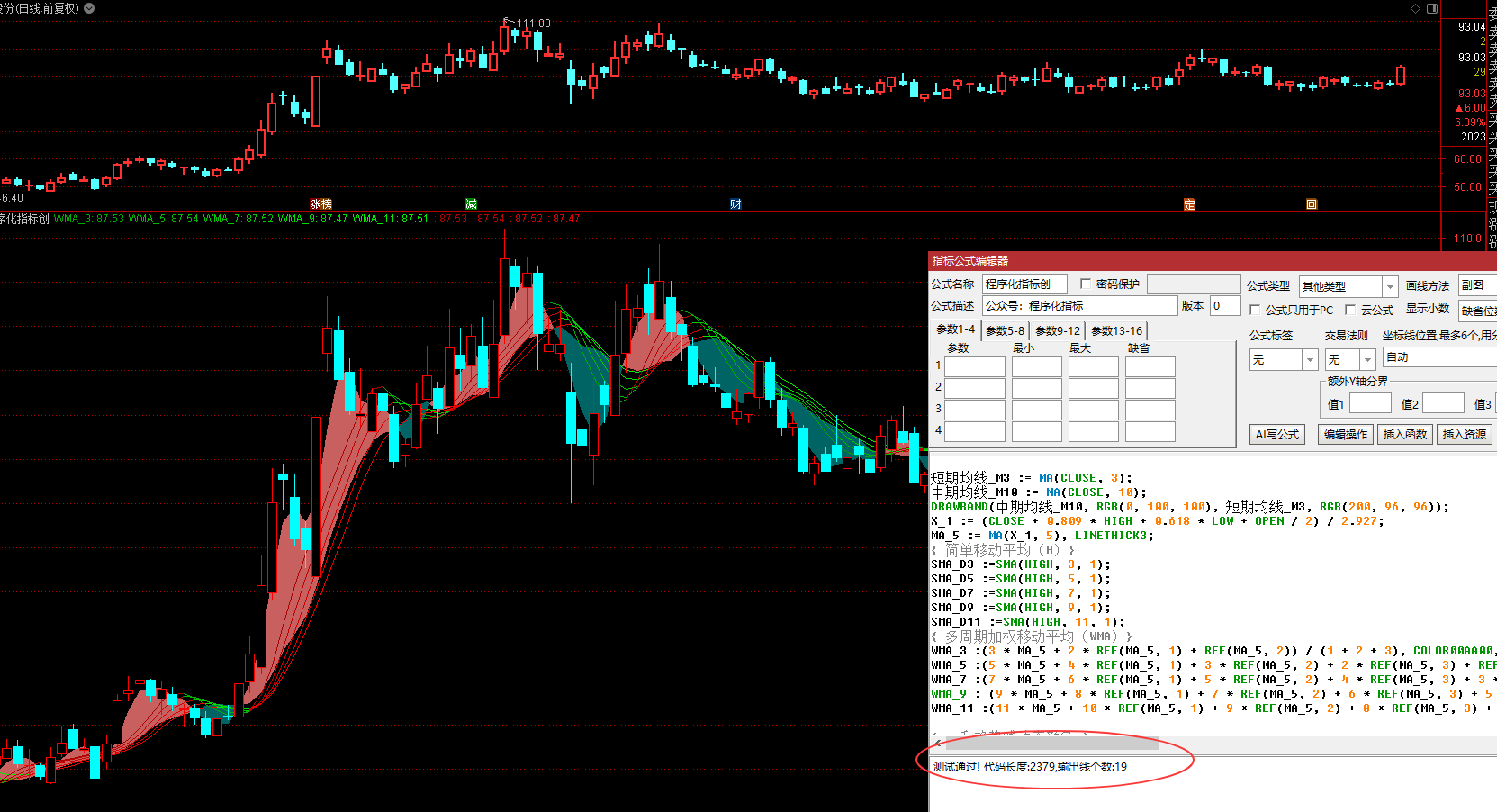 WMA_11 :(11 * MA_5 + 10 * REF(MA_5, 1) + 9 * REF(MA_5, 2) + 8 * REF(MA_5, 3) + 7 * REF(MA_5, 4) + 6 * REF(MA_5, 5) + 5 * REF(MA_5, 6) + 4 * REF(MA_5, 7) + 3 * REF(MA_5, 8) + 2 * REF(MA_5, 9) + REF(MA_5, 10)) / (11 + 10 + 9 + 8 + 7 + 6 + 5 + 4 + 3 + 2 + 1), COLOR00EE00, LINETHICK1;
