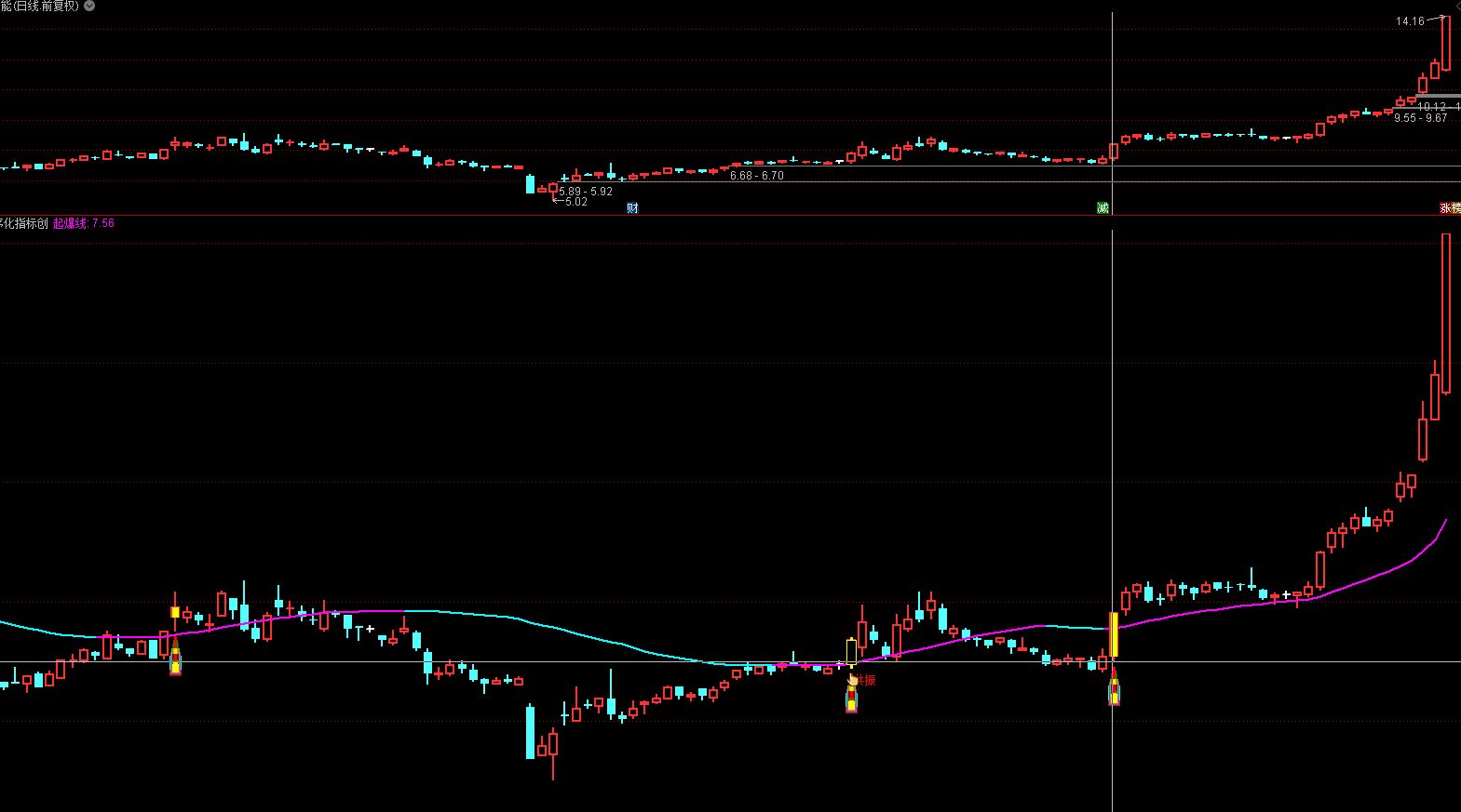 起爆线:10日高点的30日EMA(品红色粗线)