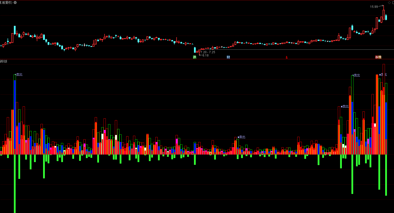 卖盘:=IF((CLOSE > OPEN),(0 - (VAR1 * ((HIGH - CLOSE) + (OPEN - LOW)))),IF((CLOSE < OPEN),(0 - (VAR1 * (HIGH - LOW))),(0 - (VOL / 2))));