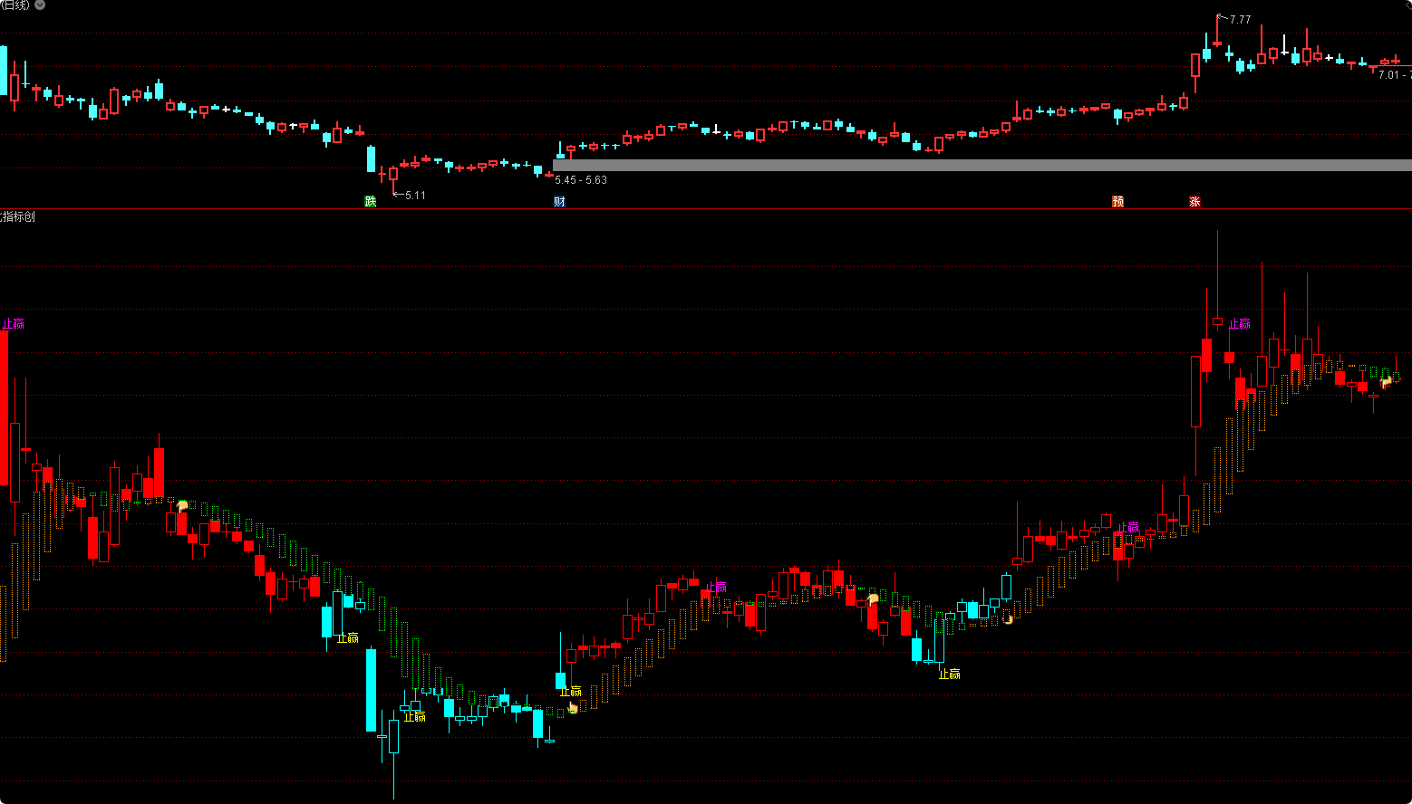 DRAWTEXT(FILTER(CROSS(70,涨跌幅) AND C < REF(L,1.5), 5), H*1.002, '止赢'), COLORMAGENTA;