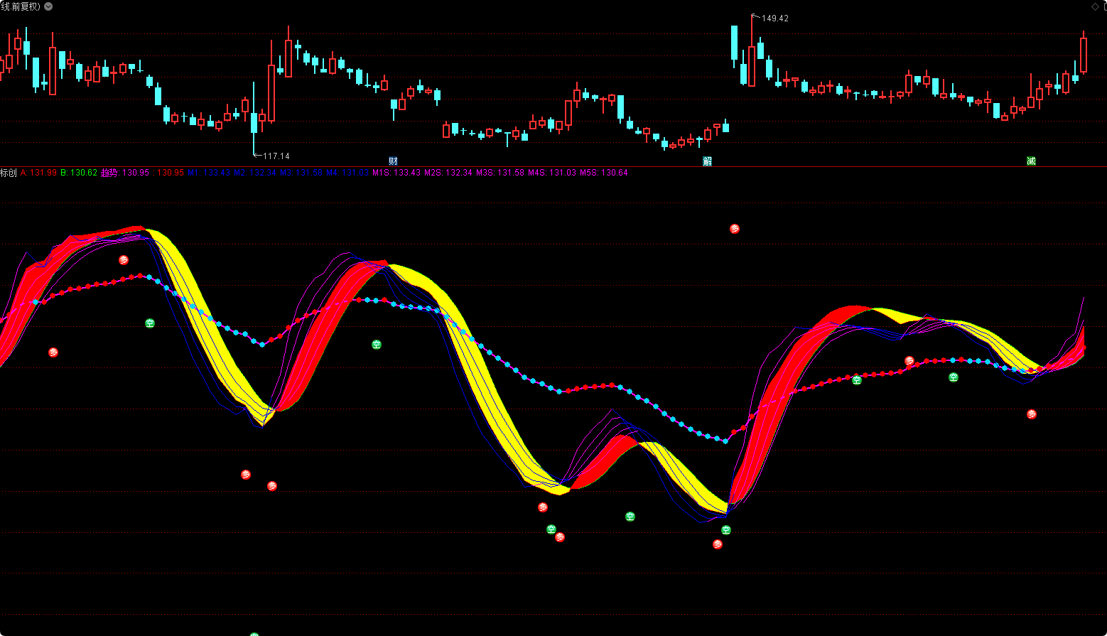 IF(趋势>=REF(趋势,1),趋势,DRAWNULL),COLORRED,POINTDOT,LINETHICK8;