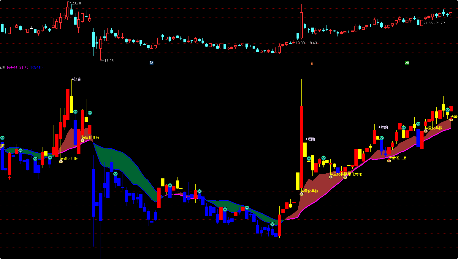 拉升线: IF(共振线 > 均线20, 均线20, DRAWNULL), COLORMAGENTA, LINETHICK3;