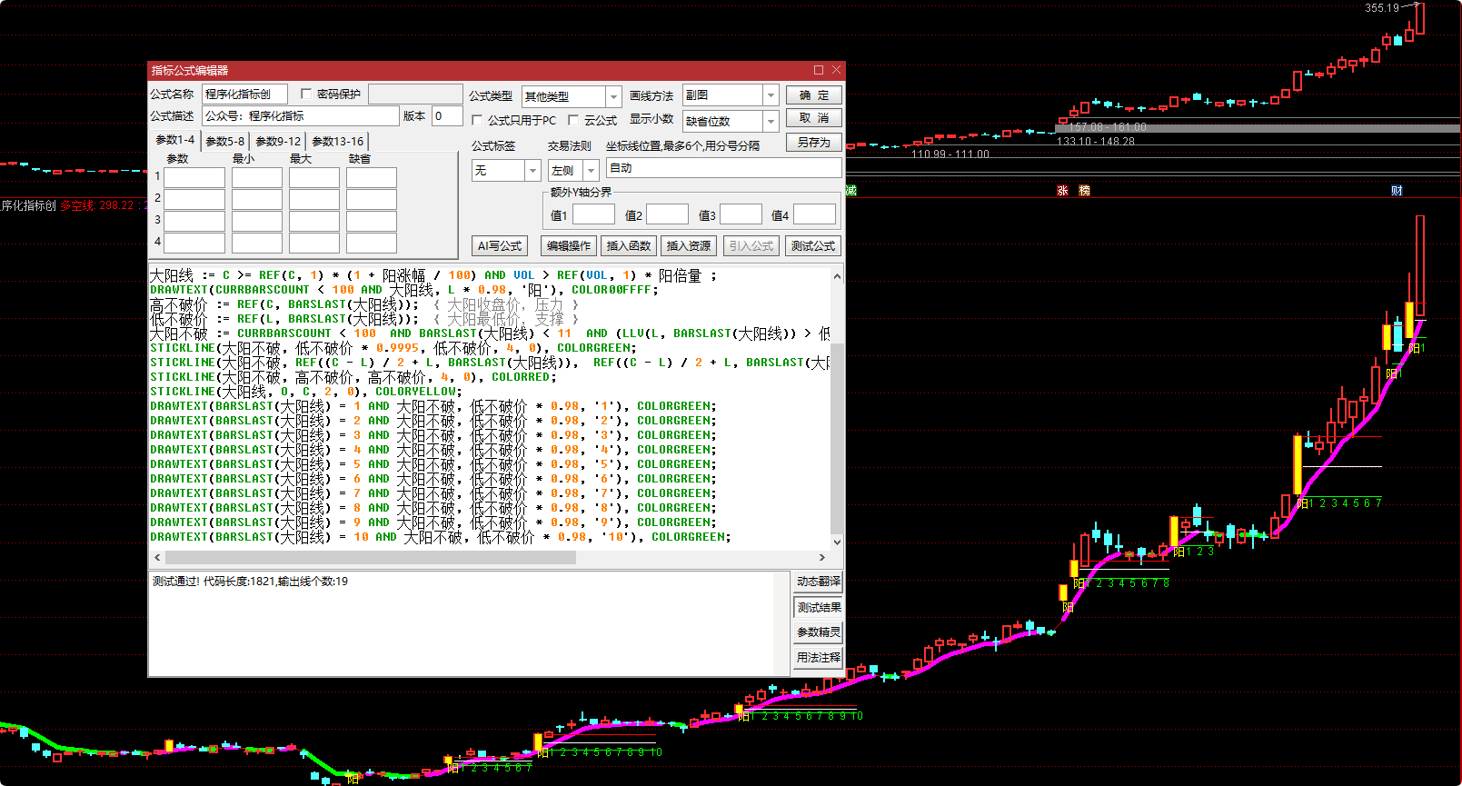 DRAWTEXT(CURRBARSCOUNT < 100 AND 大阳线, L * 0.98, '阳'), COLOR00FFFF;
