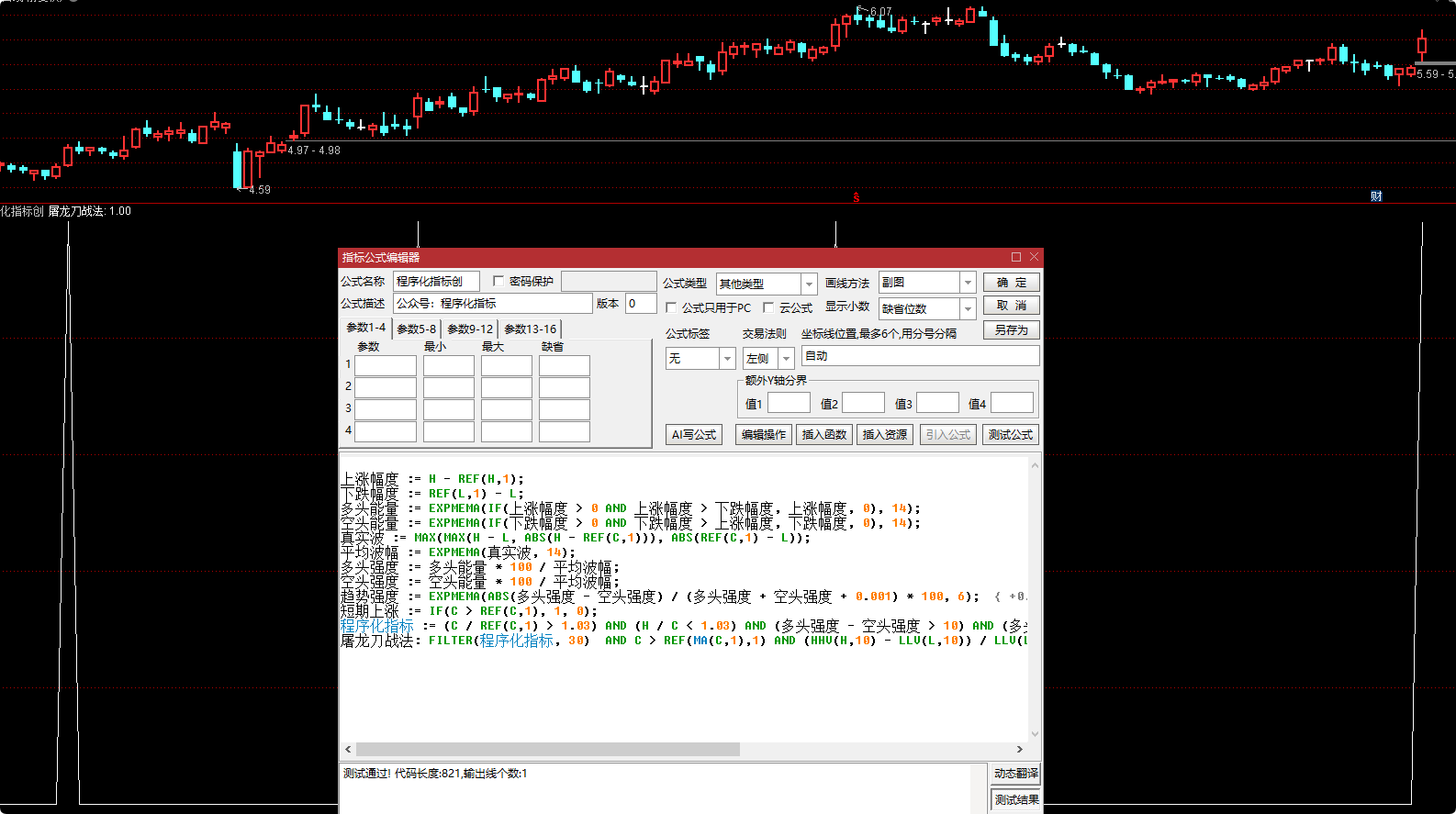 程序化指标 := (C / REF(C,1) > 1.03) AND (H / C < 1.03) AND (多头强度 - 空头强度 > 10) AND (多头强度 > 25) AND (趋势强度 > REF(趋势强度,1))AND (短期上涨 = 1);