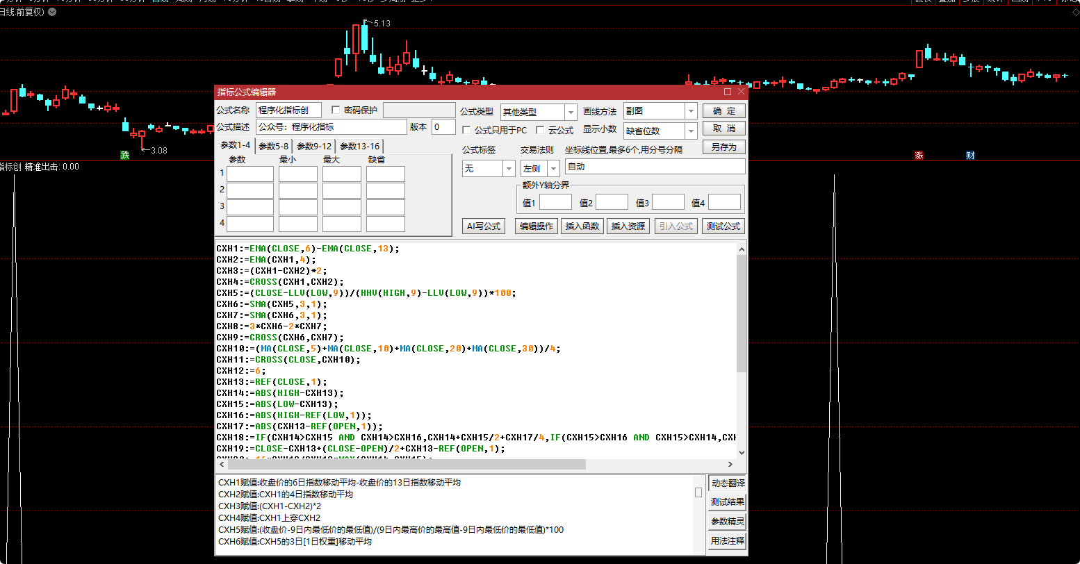 CXH19:=CLOSE-CXH13+(CLOSE-OPEN)/2+CXH13-REF(OPEN,1);