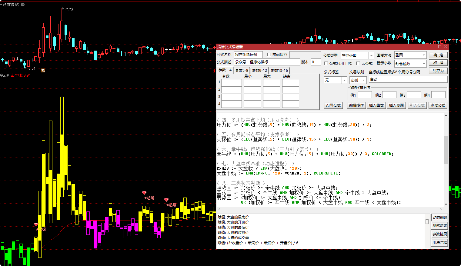 压力位 := (HHV(趋势线,5) + HHV(趋势线,15) + HHV(趋势线,30)) / 3;