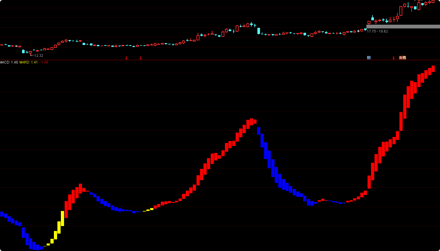IF(MACD>MARD,MACD,DRAWNULL),COLORRED,NODRAW;