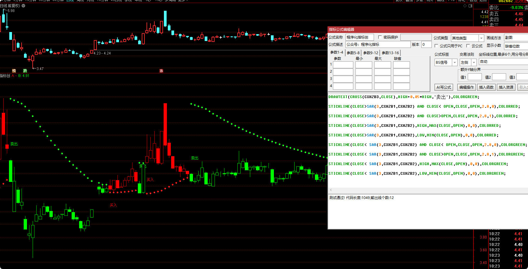 STICKLINE(CLOSE>SAR(3,CXHZB1,CXHZB2),LOW,MIN(CLOSE,OPEN),0,0),COLORRED;